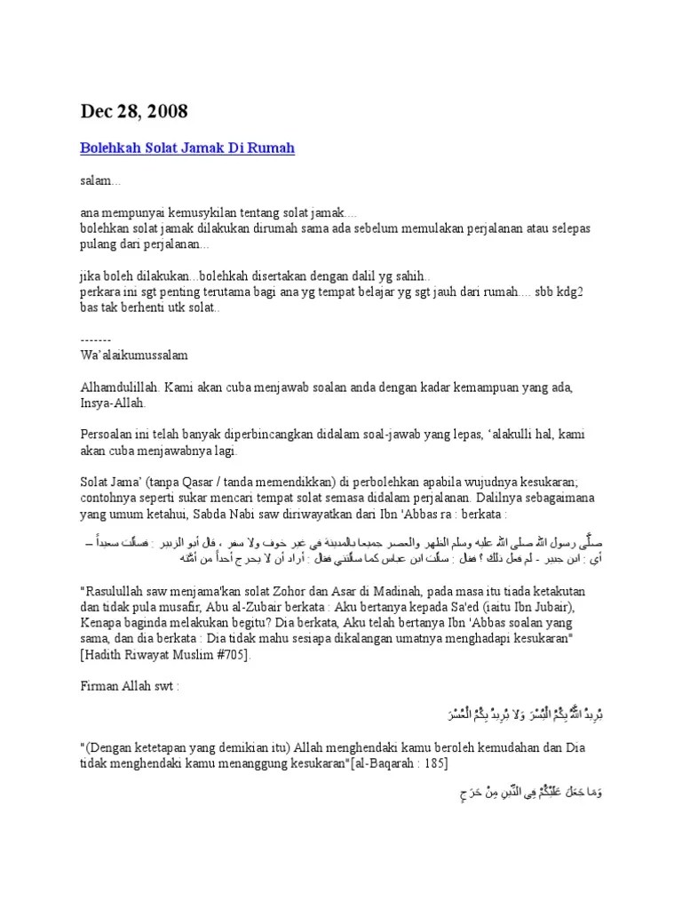 Bolehkah solat jamak di rumah setelah tamat musafir. Sedang kami berehat setelah penat bermajlis, suami sepupu isteriku hendak pergi solat. 28.12.2008 · salam, bolehkah sy solat jamak maghrib dan isyak di rumah sebelum bermusafir pulang ke kampung yang mengambil masa hanya 2 jam setengah? Melakukan solat secara jama' bukan hanya berlaku kepada orang yang bermusafir sahaja. Memandangkan keadaan yang tidak selmat solat di perhentian bas, saya ambil keputusan untuk solat jamak di rumah sahaj?